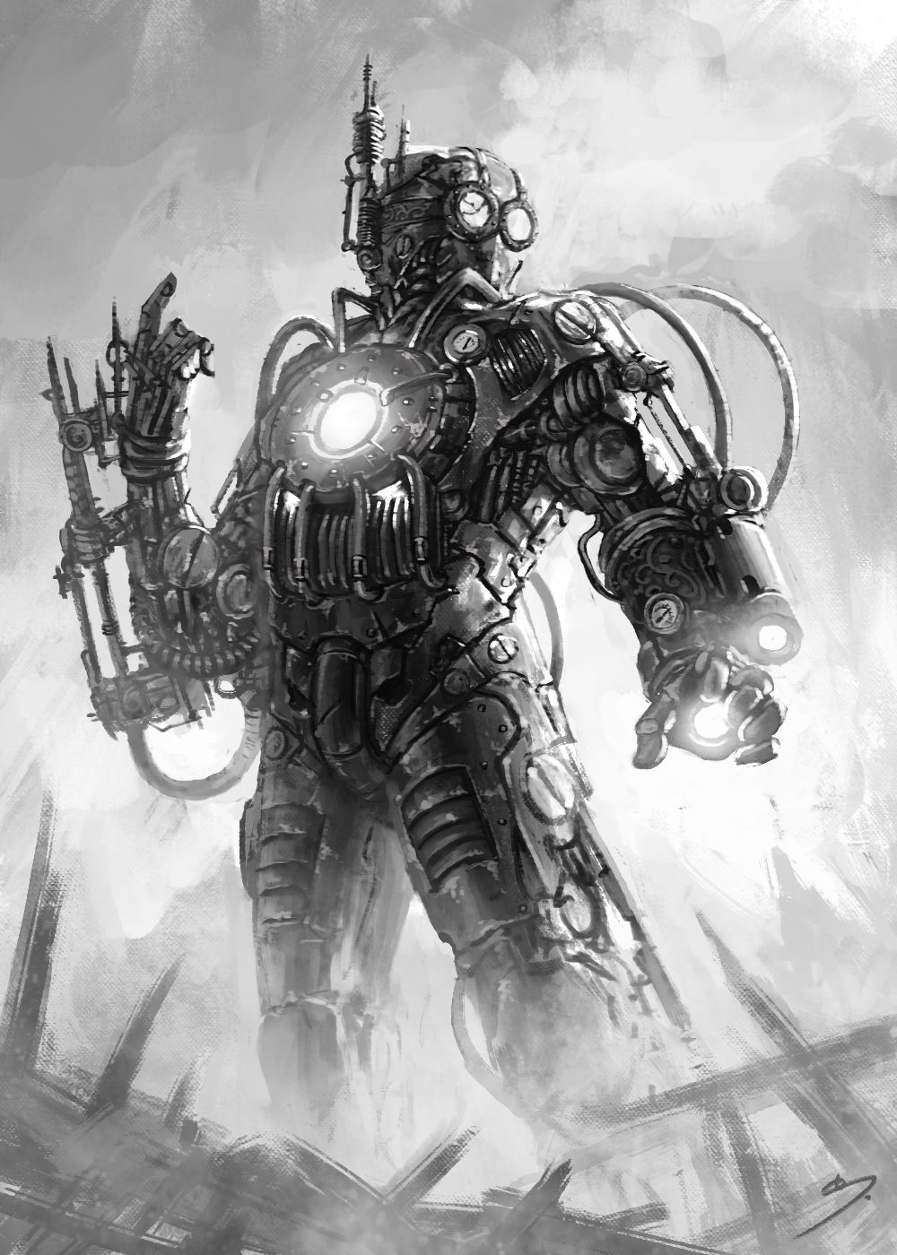If the previous look was a romanticized version of the Steam Punk await, this is the dystopian alternate past version of the graphic symbol. This gray-scale prototype created by artist SkavenZerov shows a very cybertronic (possibly non-human being) heavily wired Atomic number 26 Man. This seems to exist pulling from one of the older versions of the character that are a picayune less streamlined and sleek.