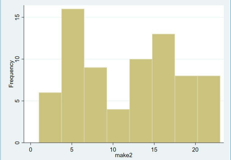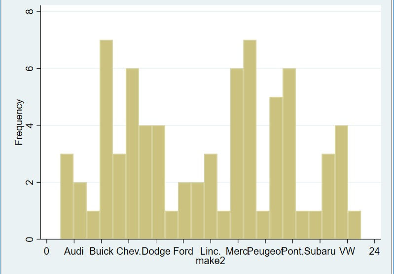 This histogram shows each make as a number along the x-axis. There are 23 different car makes in this dataset. In order to show each car maker represented on the x-axis you need to attach the labels for each number to the histogram. To do this I type the following in the command pane: