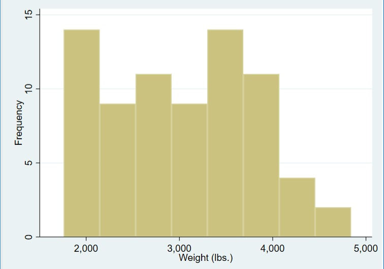 In this example I use the auto dataset to generate a histogram using the car weight data. In the command pane I type the following: